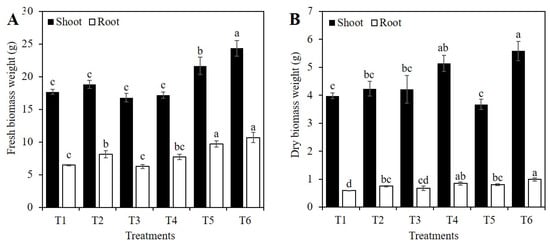 Fresh (A) and dry (B) biomass weight of shoots and roots of rice plants treated with Si and PEG. T1: Control; T2: 1 mM SiO2; T3: 2 mM SiO2; T4: 10% PEG; T5: 1 mM SiO2 + 10% PEG; T6: 2 mM SiO2 + 10% PEG. The figure represents the mean of four independent replicates. Means ± SD with different letters in each variable indicate statistical differences between treatments (Duncan, p ≤ 0.05).