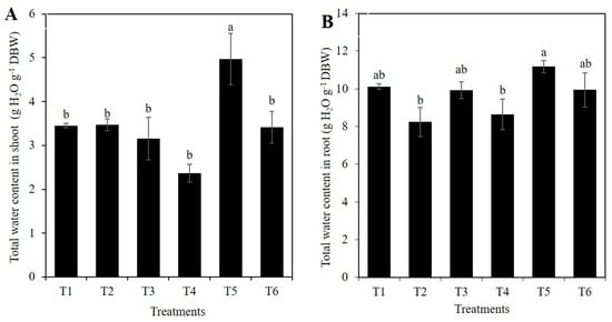 Total water content in shoot (A) and root (B) of rice plants treated with Si and PEG. T1: Control; T2: 1 mM SiO2; T3: 2 mM SiO2; T4: 10% PEG; T5: 1 mM SiO2 + 10% PEG; T6: 2 mM SiO2 + 10% PEG. The figure represents the mean of four independent replicates. Means ± SD with different letters in each variable indicate statistical differences between treatments (Duncan, p ≤ 0.05). DBW: Dry Biomass Weight.