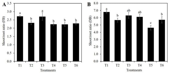 Shoot/root ratio of fresh biomass weight (A) and dry biomass weight (B) of rice plants treated with Si and PEG. T1: Control; T2: 1 mM SiO2; T3: 2 mM SiO2; T4: 10% PEG; T5: 1 mM SiO2 + 10% PEG; T6: 2 mM SiO2 + 10% PEG. The figure represents the mean of four independent replicates. Means ± SD with different letters in each variable indicate statistical differences between treatments (Duncan, p ≤ 0.05). FB: Fresh Biomass; DB: Dry Biomass.
