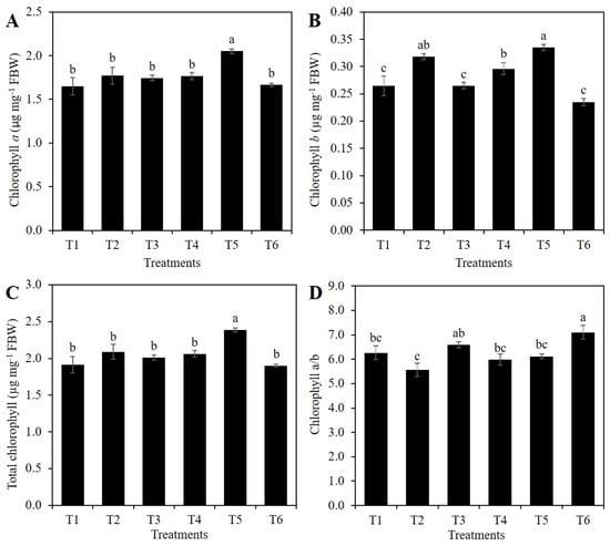 Concentration of chlorophyll a (A), b (B), total (C), and chlorophyll a/b ratio (D) of rice plants treated with Si and PEG. T1: Control; T2: 1 mM SiO2; T3: 2 mM SiO2; T4: 10% PEG; T5: 1 mM SiO2 + 10% PEG; T6: 2 mM SiO2 + 10% PEG. The figure represents the mean of four independent replicates. Means ± SD with different letters in each variable indicate statistical differences between treatments (Duncan, p ≤ 0.05). FBW: Fresh Biomass Weight.