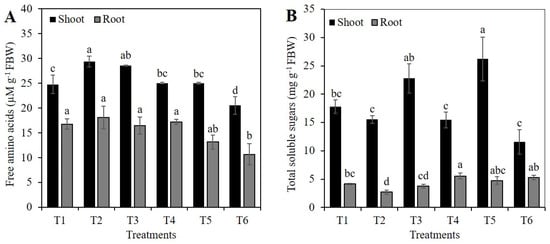 Concentration of total free amino acids (A) and total soluble sugars (B) in shoot and root of rice plants treated with Si and PEG. T1: Control; T2:1 mM SiO2; T3: 2 mM SiO2; T4: 10% PEG; T5: 1 mM SiO2 + 10% PEG; T6: 2 mM SiO2 + 10% PEG. The figure represents the mean of four independent replicates. Means ± SD with different letters in each variable indicate statistical differences between treatments (Duncan, p ≤ 0.05). FBW: Fresh Biomass Weight.