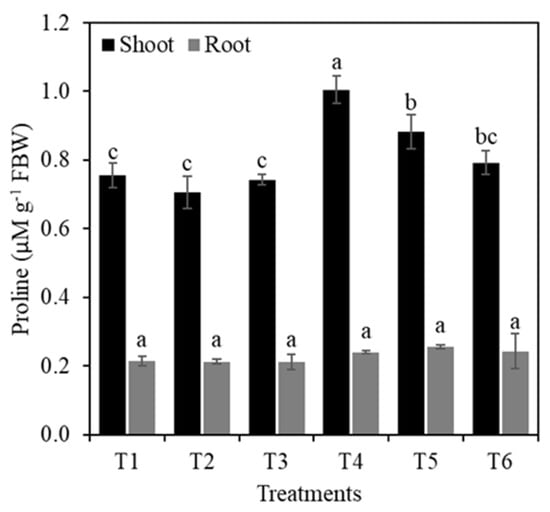 The highest concentration of proline was observed in treatment T4 (10% PEG), which was 33.1% higher than the control. The second highest proline value was found in treatment T5 (1 mM Si + 10% PEG). The rest of the treatments were statistically similar to the control (Figure 8). In roots, the treatments had no effect on the proline concentration (Figure 8).