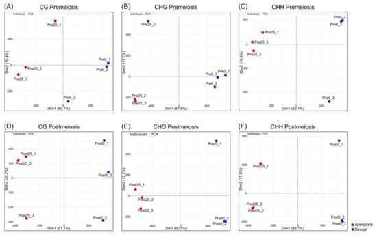 Principal component analysis based on the relative methylation levels at the DMCs obtained for each replicate and methylation context. (A−C) Premeiosis (Pre) stage and (D−F) postmeiosis (Post) stage. (A,D) CG context; (B,E) CHG context; (C,F) CHH context. Numbers in brackets indicate the fraction of overall variance explained by the respective component (Dim1, Dim2). Blue dot: highly sexual samples, red dot: highly aposporic samples.