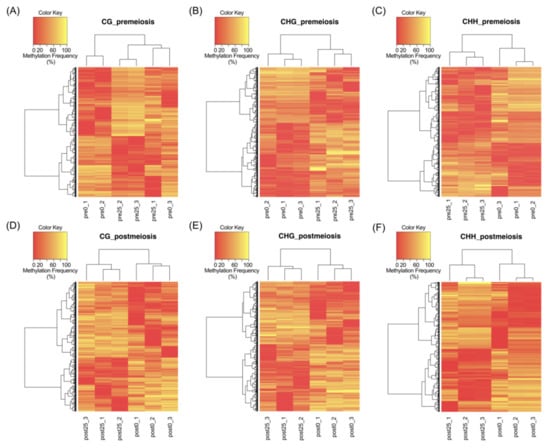 Complete linkage clustering based on the relative methylation levels at the DMCs, in each context of all samples. (A–C) Premeiosis (Pre) stage and (D–F) postmeiosis (Post) stage. (A,D) CG context; (B,E) CHG context; (C,F) CHH context of highly sexual (0) and highly aposporic (25) samples, respectively. Colors indicate the level of methylation for each position, being yellow as hypermethylated and red as hypomethylated.