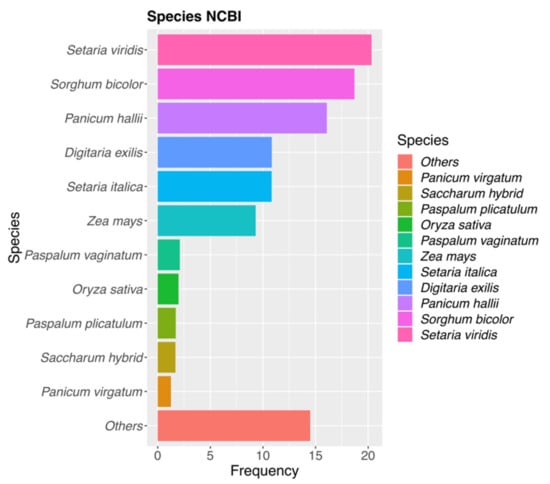 Species distribution of top hits revealed by the DCMs vs. NCBI-NT database. Most of the hits corresponded to Gramineae species and matched better with Setaria viridis and Sorghum bicolor.