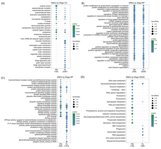 Figure 4A–C shows the 20 most representative GO terms for each category (p < 0.03), specific GO terms were found to be differentially methylated in each analyzed stage. The most represented GO terms in the CC category, both at premeiosis and postmeiosis, were ubiquitin ligase complex, endosome and cytoskeleton, while nuclear lumen and Cul4−RING E3 ubiquitin ligase complex was specific to premeiosis. Vacuolar membrane, vacuolar part Golgi apparatus, Golgi subcompartment and transferase complex were found enriched only at the postmeiosis stage (Figure 4A). Regarding the BP category, most of GO terms were common to both stages and were related to meristem and flower growth and development, such as regulation of the reproductive process, regulation of flower development, vegetative to the reproductive phase transition of the meristem, metabolic process, regulation of shoot system development, meristem structural organization, meristem maintenance, pattern specification process, regulation of post−embryonic development and mitotic cell cycle. Additionally, mRNA metabolic process, gene silencing, gene silencing by miRNA and production of miRNAs involved in gene silencing by miRNA were significantly represented at both stages. At premeiosis, some terms showed a higher enrichment than those at postmeiosis, like protein modification by small protein conjugation and protein ubiquitination, and those BP related to actin filament organization tropism, gravitropism and response to gravity were only present at postmeioisis (Figure 4B). According to the MF category, the principal enriched common terms included protein serine/threonine kinase activity, adenyl nucleotide and ribonucleotide-binding and ATP-binding. Regarding developmental stages, premeiosis showed low numbers of highly represented enriched terms as ubiquitin−like and ubiquitin-protein transferase activity. Double-stranded RNA-binding was also specific but not highly represented. At postmeiosis, ATPase activity, phosphoric ester hydrolase activity and active transmembrane transporter activity were highly represented specifically at this stage (Figure 4C).
