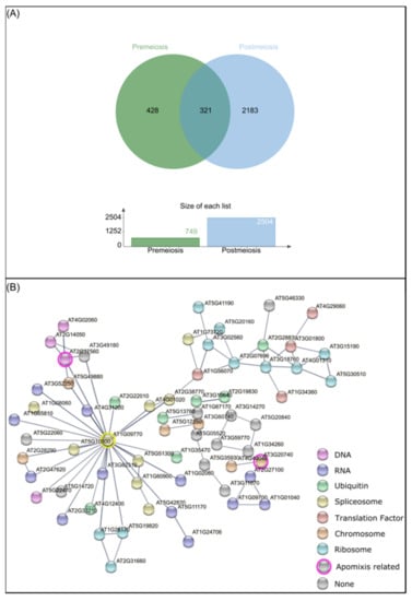 From a total of 749 genes at premeiosis and 2504 at postmeiosis, only 321 were common to both stages, while 482 and 2183 were specifically differentially methylated at premeiosis and postmeiosis, respectively (Figure 5A). The associated network among premeiosis-specific genes (Figure 5B) showed that most of them were connected. The STRING network notably showed a central node that guides almost all the connections. This central gene, CELL DIVISION CYCLE 5-LIKE (CDC5, AT1G09770), was associated with members of processes like replication, transcription, translation and post-translation processes. Interestingly, DNA replication (Figure 5B, pink-tagged), mitosis as well as chromosome-associated proteins involved in nucleosome assembly were detected (Figure 5B, orange-tagged). Two genes previously reported as components of apomixis cascade were connected, FIE (AT3G20740), [] and ORC2 (AT2G37560) []. Additionally, a high number of genes involved in RNA metabolism like RNA synthesis, degradation, transport and posttranscriptional silencing (Figure 5B, lilac) as well as those related to splicing were also connected (Figure 5B, yellow-tagged). Additionally, a set of genes involved in protein translation and post-translational regulation as a ribosome pathway, translation factors (Figure 5B, light blue and red-tagged, respectively), ubiquitin system and membrane trafficking (Figure 5B, green-tagged) were also found.
