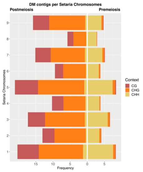 Frequency distribution of DCMs on Setaria italica chromosomes at both stages of development, premeiosis (right) and postmeiosis (left) in each methylation context.