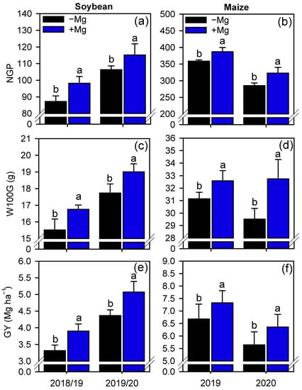 - Altarugio, L.M.; Loman, M.H.; Nirschl, M.G.; Silvano, R.G.; Zavaschi, E.; de Mello e Silva Carneiro, L.; Vitti, G.C.; de Cerqueira Luz, P.H.; Otto, R. Yield performance of soybean and corn subjected to magnesium foliar spray. Pesqui. Agropecu. Bras. 2017, 52, 1185–1191. [Google Scholar] [CrossRef]