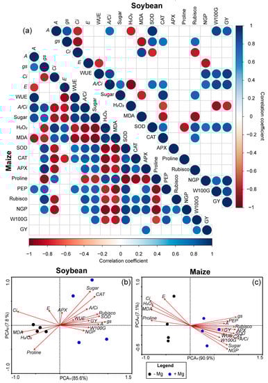 2.5. Pearson’s Correlation and PCA among Soybean and Maize Parameters