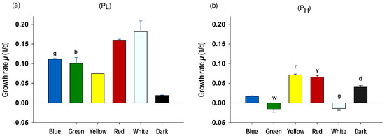 Growth rates of A. protothecoides cultivated photoautotrophically for seven days with different light wavelengths: (a) with low peptone (PL) and (b) with high peptone (PH). Each bar represents the average ± SD of n = 3 replicates. The letters (b: blue, g: green, y: yellow, r: red. w: white, and d: dark) indicate that there were no statistically significant differences between the means (two-way ANOVA; Duncan method; p < 0.05) of the pairwise comparisons between the different wavelengths. Between the variable groups PL and PH there were statistically significant differences (p < 0.01).