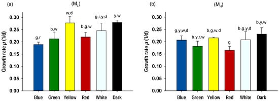 Growth rates of A. protothecoides cultivated mixotrophically for seven days with different light wavelengths: (a) with low peptone (ML) and (b) with high peptone (MH). Each bar represents the average ± SD of n = 3 replicates. The letters (b: blue, g: green, y: yellow, r: red. w: white, and d: dark) indicate that there were no statistically significant differences between the means (two-way ANOVA; Duncan method; p < 0.05) of the pairwise comparisons between the different wavelengths. Between the variable groups ML and MH there were statistically significant differences (p < 0.01).