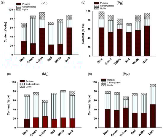Biochemical composition of A. protothecoides cultivated in different light wavelengths under photoautotrophic conditions with (a) low peptone and (b) high peptone concentration, and in mixotrophic conditions with (c) low peptone and (d) high peptone concentration. Each bar represents the average of n = 3 replicates.