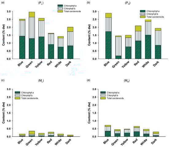 Mixotrophy significantly affected the pigment content (p < 0.01) (Figure 4), which was highly decreased (from about 2.1% on average for all pigments for PL and PH to about 0.35% on average for ML and MH). It has been frequently reported that mixotrophy itself influences the pigment content of microalgae [], because in the presence of organic molecules (such as glucose or glycerol) cells synthesize less photosynthetically active pigments. Thus, under mixotrophic conditions cells can harvest energy from the organic compounds and are therefore less dependent on light availability compared to the photoautotrophic conditions, under which they absolutely depend on light energy for their growth []. A strong effect was also observed in green light, where chlorophyll b content was the highest in both PL and PH cultures (1.35% and 1.21%, respectively). No other clear effect of light wavelength on pigments was observed. Three-way ANOVA analysis revealed that the only statistically significant variable was the trophic conditions, and any other interaction was not significant.