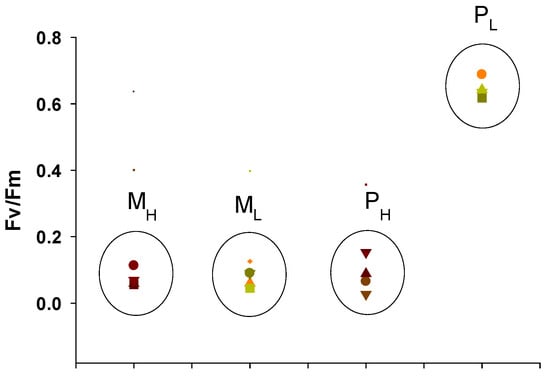 Maximum quantum yields of primary photochemistry (Fv/Fm) of A. protothecoides cultivated under the different conditions (each circle represents a different cultivation treatment; MH and ML stand for mixotrophy with high and low peptone, respectively, and PH and PL stand for photoautotrophy with high and low peptone, respectively).