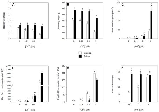 2.1. Plant Growth under Cd Stress and Cd Partitioning between Roots and Shoots