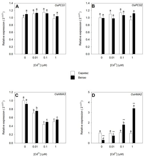 2.3. Effects of Cd Exposure on the Relative Expression of Genes Involved in Cd Chelation, Compartmentalization, and Translocation