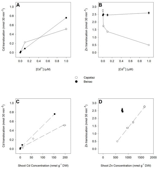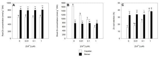 2.4. Effects of Cd on Zn Partitioning between Roots and Shoots