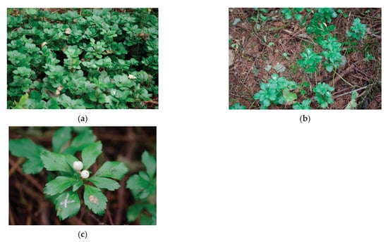 Photographs of Pachysandra terminalis Siebold et Zucc. (a) A dense stand in a relatively better-lit plot. (b) A sparse stand in a shaded plot. (c) Drupes. Markings or numberings by ink pens appear on some leaves. Photographs were taken on 1 October 2020 by Kohei Koyama. High-resolution images are available in the Supplementary Materials.
