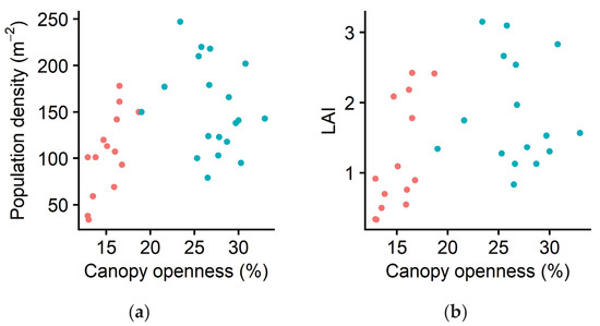 (a) Population density (i.e., the total number of ramets in each 1 m2 subplot) in spring and (b) leaf area index (LAI, i.e., total leaf area per unit land area) in relation to canopy openness in spring. Each symbol indicates the value of one subplot. Red: Forest of Obihiro. Blue: forest of the Hokkaido Obihiro Agricultural High School. The dataset is available as a part of the Supplementary Materials.