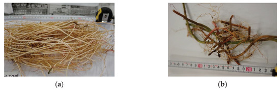 (a) Thin and (b) thick rhizomes. Photographs were taken on 18 October 2020, by Kohei Koyama. High-resolution images are available in the Supplementary Materials.