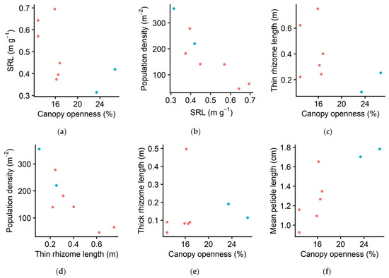 (a) Specific rhizome length (SRL; i.e., length per unit mass, thin and thick combined) in relation to canopy openness. (b) Population density (i.e., the number of ramets in each 1 m2 subplot in autumn) in relation to SRL. (c) Thin rhizome length per ramet (i.e., the total thin rhizome length in each subplot divided by the number of ramets in that subplot) in relation to canopy openness. (d) Dependence of population density on thin rhizome length per ramet. (e) Thick rhizome length per ramet in relation to canopy openness. (f) Mean petiole length in relation to canopy openness. Each symbol indicates the value of one subplot. Red: Forest of Obihiro. Blue: forest of the Hokkaido Obihiro Agricultural High School. The dataset is available as a part of the Supplementary Materials.