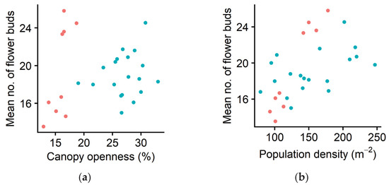 Mean number of flower buds on each ramet in relation to (a) canopy openness and to (b) population density (i.e., number of ramets in each subplot) in spring. Each symbol indicates the value of one subplot. Red: Forest of Obihiro. Blue: forest of the Hokkaido Obihiro Agricultural High School. The dataset is available as a part of the Supplementary Materials.