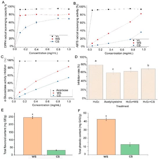TFC and TPC differences between WS and CS were determined. As shown in Figure 1E,F, the results showed that TFC and TPC levels in WS were 219.51 ± 5.18 mg QE/g and 41.53 ± 1.25 mg GAE/g, respectively, which were significantly higher than those in CS (p < 0.05).