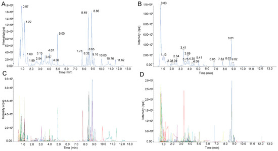 Total ion current of one quality control sample by mass spectrometry detection in (A) positive mode and (B) negative mode. Multi-peak detection plot of metabolites from multiple reaction monitoring in (C) positive mode and (D) negative mode.