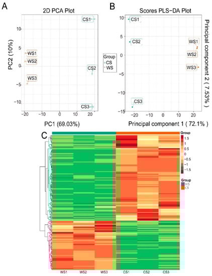 PCA and OPLS-DA results for the WS versus CS groups. PCA scatter plots: (A) principal component (PC1 versus PC2) (2D); (B) score scatter plot of the OPLS-DA model; (C) clustering heat map of the differential metabolites in WS and CS. The metabolite content data were normalized using maximum difference normalization. Each metabolite is represented by a row and each sample by a column. The color represents the abundance of each metabolite.