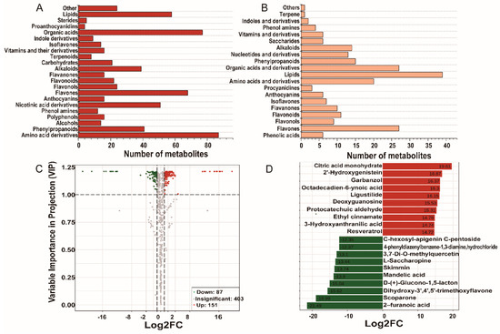 From the 79 flavonoid compounds, 42 were significantly upregulated in WS, while 37 were significantly upregulated in CS. As shown in Figure 5, several subclasses of flavonoids (including isoflavones, flavones, flavonoid, flavonols, flavanones, proanthocyanidins, and anthocyanins) putatively annotated in the present study were significantly different between WS and CS.