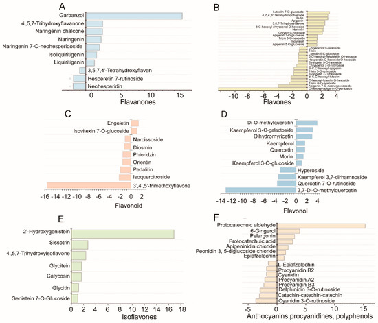 Significant differential flavonoids metabolites in WS and CS. (A–F) indicate the log2-fold-change of flavanones, flavones, flavonoid, flavonol, isoflavones and anthocyanins, procyanidines polyphenol, respectively, in WS versus CS.