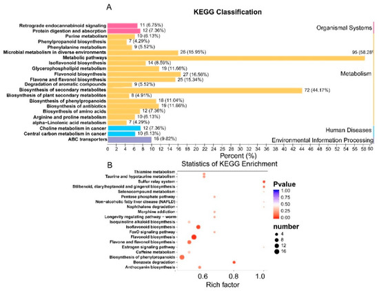 KEGG classification and enrichment of differential flavonoid metabolites for WS versus CS. (A) The vertical axis represents the names of the KEGG metabolic pathways, while the horizontal axis gives the ratio of metabolites annotated to a pathway to the total number of annotated metabolites in percentage values. (B) The vertical axis represents the enrichment factor of each pathway, while the horizontal axis shows the names of the pathways. The color of each point in this figure represents its P-value; the redder a point, the more significant its enrichment. The size of a point represents the number of differential metabolites that have been annotated to its corresponding pathway.