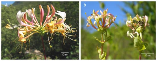 Flowers of Lonicera etrusca: (a) Healthy flowers. (b) Damaged flowers as a consequence of phloem-feeding by Hyadaphis passerinii. In this image, the inflorescence on the left shows flowers damaged by aphids that are no longer present, and the one on the right is damaged with aphids present.