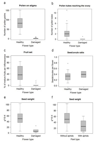 Consequences of herbivory by the phloem-feeding herbivore Hyadaphis passerinii for different parts of the pollination and post-pollination processes. (a) Arrival of pollen to stigmas; (b) pollen tubes growing down to the ovary; (c) fruit set; (d) number of seeds/number of ovules per ovary (Seed:ovule ratio); (e) weight of the seeds from healthy and damaged flowers; (f) weight of the seeds from healthy flowers from plants without aphids, and plants highly infested by aphids (with aphids). Box plots represent medians (horizontal lines), quartiles (boxes), 0.25−1.5 IQR and 0.75 + IQR (whiskers), and outliers (open dots).