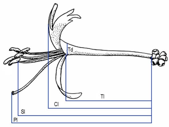 Floral traits characterised to assess the effects of herbivory by aphids on floral development of Lonicera etrusca: pistil length (Pl), stamen length (Sl), corolla length (Cl), tube length (Tl), and tube diameter (Td).