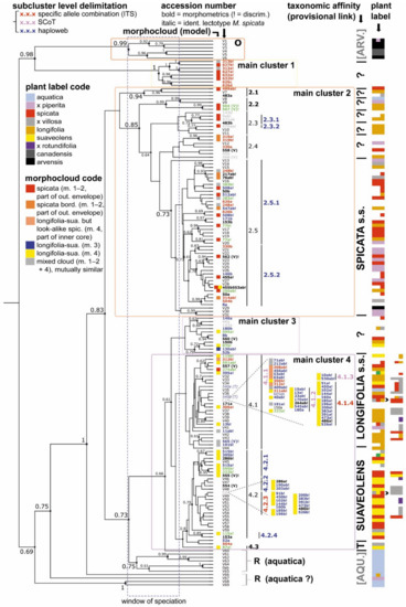 The SCoT analysis further revealed three clear groups of individuals within the phylogenetic cluster 4.1 (M. longifolia complex s.s.), subclusters 4.1.1, 4.1.2 and 4.1.3. The first two subclusters correspond to M. longifolia L. subsp. longifolia and the related M. longifolia subsp. nemorosa (Willd.) Wimm. & Grab./M. nemorosa Willd., respectively. Confusingly, samples found in subcluster 4.1.3 are traditionally typically labeled as M. spicata L. subsp. spicata.