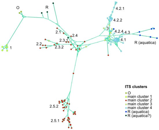 The main cluster 1 (PP = 1.00) encompasses a distinct group of sequences amplified from samples belonging to the classic phylogenetic subsection ‘Spicatae’ (Figure 1). These sequences are also found on an isolated branch in the haploweb (Figure 2). Most other samples traditionally grouped among the Spicate mints are found in the main clusters 2–4 (Figure 1). Basal to the main clusters 3–4 and to the main clusters 2–4 there are two groups of samples (‘R’) that are taxonomically recognized as M. aquatica or its hybrids M. × piperita or M. × dumetorum, which traditionally belong to the phylogenetic subsection ‘Capitatae’ [] (Figure 1; Table 1).