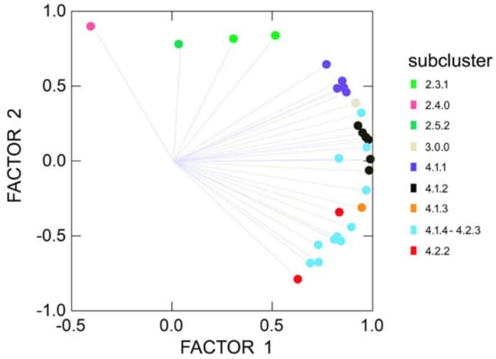 The first PCF axis (λ1 = 21.83; σ12 = 68.2%) separates samples in subclusters 2.3.1, 2.4 and 2.5.2 from all other samples (Figure 3). The second dimension (λ2 = 7.36; σ22 = 24.8%) then separates samples in the subclusters 3 and 4.1 (M. longifolia s.s.) from those of 4.2.2 (M. suaveolens subsp. suaveolens). Samples recognized as the hybrid M. × rotundifolia (4.1.4 × 4.2.3) are found between or intermingled with the two parental species M. longifolia (4.1) and M. suaveolens (4.2.2; Figure 1 and Figure 3). This taxon includes some samples traditionally labeled as M. × villosa var. alopecuroides (Hull) Briq., that consequently should be changed into M. × rotundifolia nothovar. alopecuroides. Nevertheless, M. × rotundifolia is considered as a separate unit here (4.1.4 × 4.2.3).