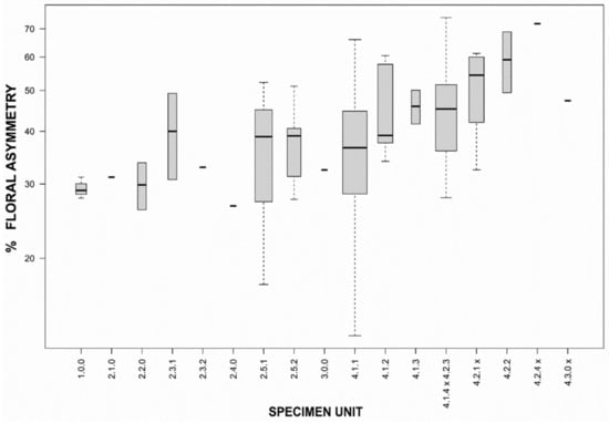Boxplot: degree of floral asymmetry per specimen unit. Plot indicating the percentage asymmetry (the combination of the variables numbered as 27 and 32; Table S2) observed in flowers belonging to each of the studied genotypic units.