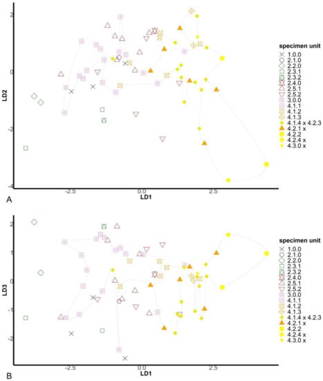 The Stewart–Love canonical redundancy index equals 0.323 when based on the first six dimensions of the constrained DA-space as well as the full morphospace (a PCF with a cumulative six-dimensional variance of 46.0% of the total morphological variation). This implies that 32.3% of the generic signals of the full morphospace are explained by the variation among the specimen units in the reduced (constrained) morphospace. However, 96.3% (ΔW = 0.037, p < 0.001) of the between-group morphospace dispersion among the 17 genotypically defined specimen units is explained by the six significant morphological variables (Figure 5 and Figure 6, Table S2).