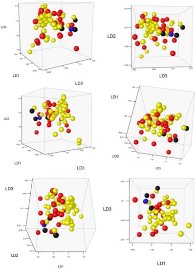 Discriminant analysis visualizing the general morphocloud pattern. Discriminant analysis results with 3D pattern reflecting general relationships between main groups. The inner core–outer envelope shows how the M. longifolia s.s.–suaveolens complex and the M. spicata complex, respectively, are mutually connected and at the same time also largely separated. The outer envelope contains accessions with sequences belonging to main clusters 1 (black) and 2 (red), while the inner core has sequences belonging to main cluster 4 (yellow). Note that the only morphologically analyzed accession with sequences from main cluster 3 (blue) is ordinated at the outer edge.