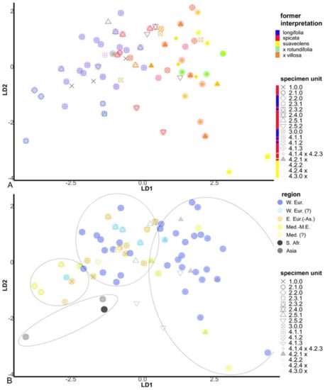 The DA results offer a nice arrangement of genotypic units sorted along principal dimensions, pointing to a substantively strong correspondence between the modeled morphology and the genetic groups at a higher taxonomic level (Figure 6). The overwhelmingly consistent inner core–outer envelope pattern emerged irrespective of the imposed genotypic structure, which highlights the relevance of the selected morphological variables regardless of technical and statistical qualities in a model context that initially led to the (penalized) selection. Therefore it is probably no coincidence that exactly highly relevant morphological features at genus or family level such as floral asymmetry (Table S2, Figure 4) show systematic and meaningfully structured differences for varying genotypic groups. Hedge [] pointed to Mentha as an example of evolutionary trends in the Lamiaceae family, not in the least concerning floral asymmetry (actinomorphic versus zygomorphic flowers). Traits such as floral asymmetry and varying patterns of oil glands are possibly involved in insect–flower coevolution [,,,,], and such traits are likely to be important for speciation. Some of the selected leaf characteristics (such as petiole and venation; Table S2) also have ecological relevance, for example, in response to varying humidity levels in the atmosphere and soil or in relation to herbivory (e.g., []), and are linked to differential adaptation (e.g., [,]). The genetic and morphological distinctions between the species are further supported by obvious biogeographic differences between the taxa (Figure 7B).