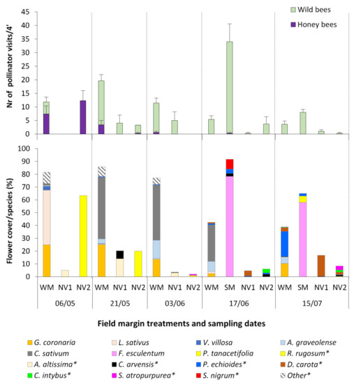 The type of treatment (WM or SM vs. natural vegetation margin) and the sampling time had a significant effect on the number of wild bees and pollinators in total (2-way ANOVA, p = 0.05; Supplementary Table S2) while their interaction was not significant. The WM field margin attracted significantly higher number of total pollinators (10 visits/plot/4′) compared to the NV1 and NV2 plots (two and four visits/plot/4′, respectively) while higher number of pollinators was recorded in late-May to early-June, compared to that in mid-June to mid-July, which is in line with the decline in flowering recorded after mid-June in the winter sown species (Figure 1 and Supplementary Table S2). The SM field margin also had significantly higher number of total pollinators (21 visits/plot/4′), compared to either the NV1 or NV2 site (0.3 and two visits/plot/4′, respectively), with significantly more visits recorded in mid-June compared to mid-July (Figure 1 and Supplementary Table S2). The number of wild bee visits recorded at the SM margin in mid-June was the largest recorded across all measurements in any margin type and sampling date (33.7 ± 6.6 visits/plot/4′). Wild bees were highly attracted by F. esculentum, which had a flowering peak at that time (Figure 1).