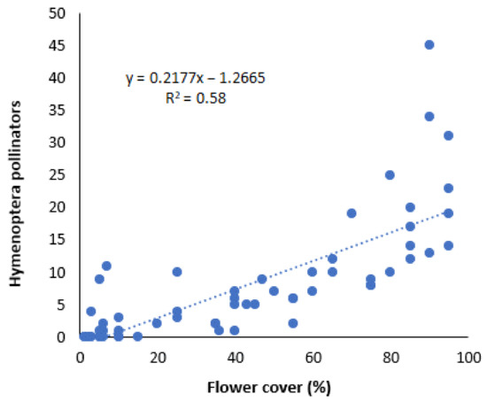 The Hymenoptera pollinators were honeybees early in the season and predominantly wild bees thereafter (Figure 1). Bumble bees or megachilids were not present at any sampling date. The total number of Hymenoptera pollinators visiting the flowers of the sown or the natural vegetation plants in the margins and the corresponding percentage of flower cover in each site had a positive correlation (R2 = 0.58) (Figure 2).