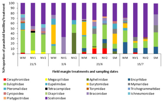 The WM attracted an arthropod community (phytophagous insects, natural enemies) of greater diversity in comparison to the SM and the NV sites. It attracted more parasitoid families, with a larger number of individuals throughout the season, although the family sizes fluctuated with time. Overall, the flower cover diversity had only a weak correlation with the beneficial arthropod abundance but not their diversity. This was probably due to the large variability between the various field margin types (sown or with natural vegetation) which may have hindered the evidence of the positive relationship between beneficial arthropods and flowering plant diversity, confirmed in other studies [56].