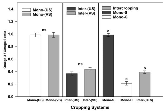 The ratio between omega 3 and omega 6 FAs under corn and soybean cropping systems during the 2016 and 2017 growing seasons. Explanations: ns = non-significant. The error bar represents SE. Different letters indicate differences between the cropping systems at LSD = 0.05. Mono C = Monocropping Corn; Mono S = Monocropping Soybean; Mono-(US) = Monocropping Upright Soybean; Mono-(VS) = Monocropping Vine Soybean; Inter-(US) = Upright Soybean Intercropped with Corn; Inter-(VS) = Vine Soybean Intercropped with Corn.