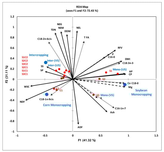 The first axis (F1) of the RDA biplot explained 41.32%, and the second axis (F2) explained 31.11% of the total variation in the data. The first axis (F1) correlated positively with ash, CP, AP, DMI and RFV but was negatively correlated with SS, SP, WSC and NDF. The second axis (F2) was positively correlated with net forage energies, DDM and TDN, while a negative correlation was observed with ADF contents.