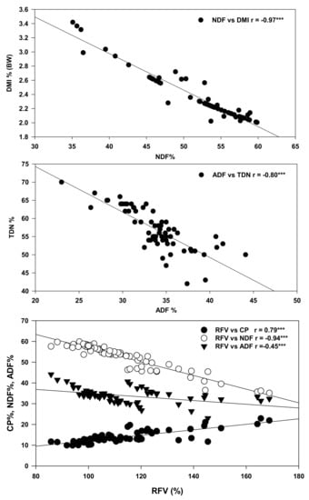 Pearson correlation between NDF and DMI; ADF and TDN; RFV and CP, ADF and NDF for different corn–soybean monocropping and intercropping treatments. CP = crude protein; NDF = neutral detergent fiber; ADF = acid detergent fiber; RFV = relative feed value; DMI = dry matter intake; TDN = total digestible nutrients; ns = non-significant; * correlation is significant (p ≤ 0.05); ** (p ≤ 0.01); *** (p ≤ 0.001), n = 66 for all parameters.
