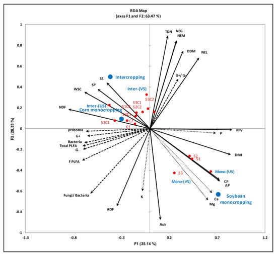 Redundancy analysis (RDA) showing the relationship between the fodder quality parameters and rhizosphere soil microbial community. The microbial community (PLFAs) are represented by dashed arrows, minerals by dotted arrows and fodder quality by solid arrows. G+ (gram positive bacteria); G- (gram negative bacteria); PLFAs (phospholipid fatty acids); CP (crude protein); AP (available protein); SP (soluble protein); SS (soluble sugars); TDN (total digestible nutrients); NEL (net energy lactation); NEM (net energy maintenance); NEG (net energy gain); WSC (water soluble carbohydrates); NDF (neutral detergent fiber); ADF (acid detergent fiber); DMI (dry matter intake); DDM (digestible dry matter); RFV (relative feed value); TFA (total fatty acids); Mono-(VS) = vine soybean monocropping; Mono-(US) = upright soybean monocropping; Inter-(US) = upright soybean intercropped with corn; Inter-(VS) = vine soybean intercropped with corn.